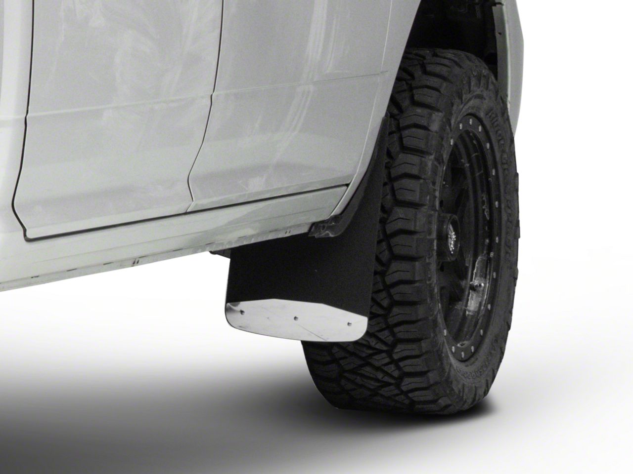 Recycled Rubber Construction. With these Textured Rubber Front Mud Guards, you can protect your vehicle and help the environment at the same time. These mud guards are made of recycled rubber material cut and shaped to fit your truck. It is 3/8-inch thick, giving it a rigid structure that can stand up to heavy abrasions. The guards also have polished stainless steel plates at the bottom that are not only for good looks but also for added strength and durability.