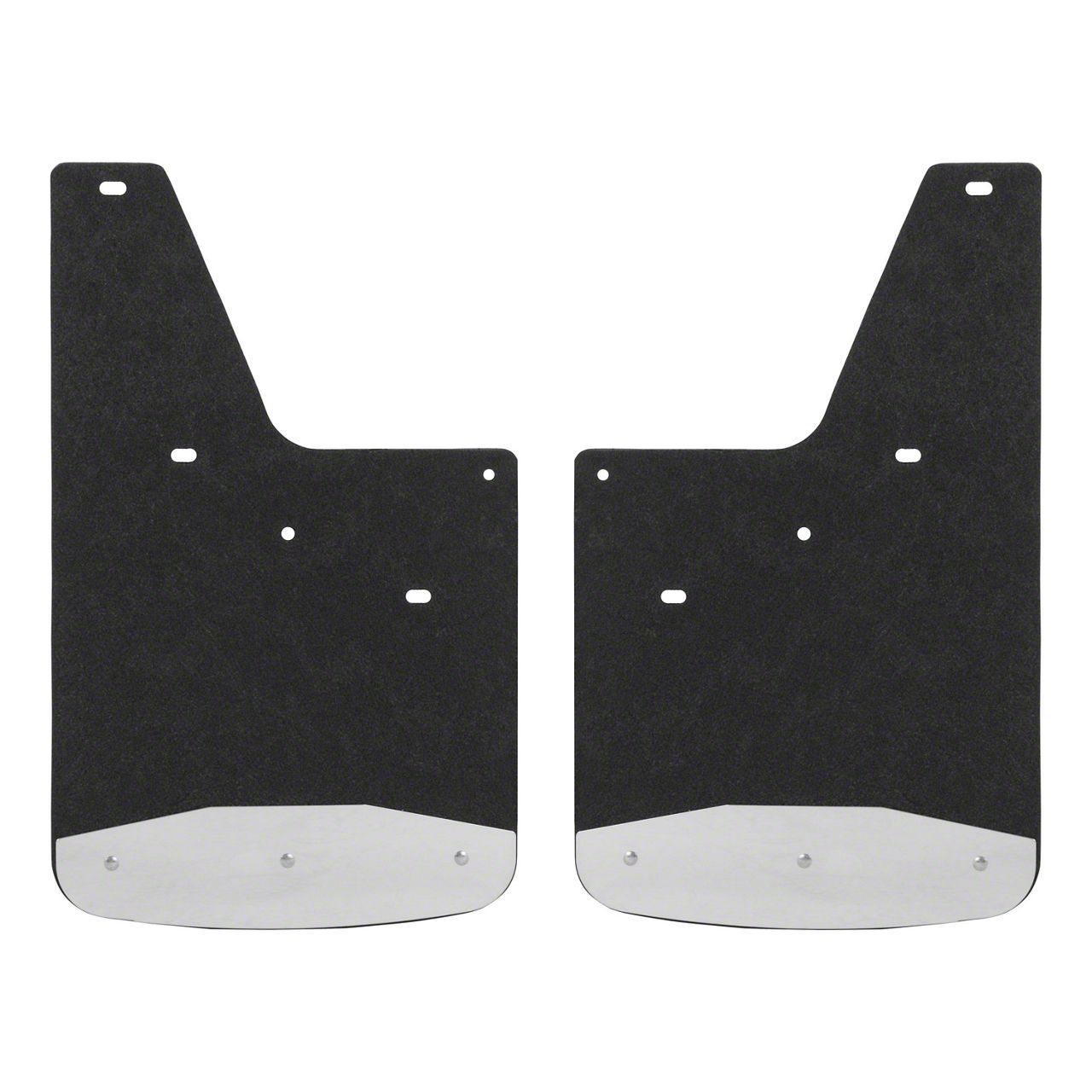 Get in Your Truck with Ease. Keep rocks and debris from hitting your valuable paint with the ultra-tough Textured Rubber Front or Rear Mud Guards - 12 Inch x 20 Inch. These 12 inch by 20 inch textured rubber mud guards feature 18-gauge stainless steel plates and a black powder coated finish for extra abrasion resistance.