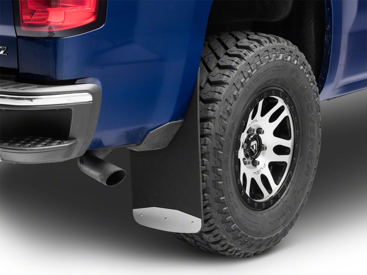 Keeps Road Debris Away from Truck. These Textured Rubber Front or Rear Mud Guards - 12 Inches x 23 Inches attach to both front and rear wheel wells of your Chevrolet Silverado 1500 to protect it from stone chips, mud, and other types of road debris. Credit is due to its semi-flexible heavy-duty 3/8-inch-thick recycled rubber manufacture, as well as high-polish 18-gauge stainless-steel plates covering the bottom edges to extend their lifespan. And as a bonus, these flaps, which are finished with a textured black powder coat, will renew the exterior profile of your truck.