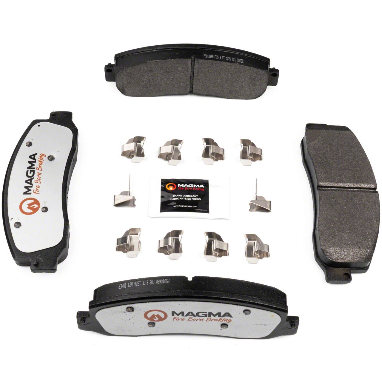 WHY MAGMA? - Today's harsh stop and go environment can create very high heat levels in your braking system which can reduce the vehicle's ability to stop. Extreme high temperatures can be reached in many braking situations such as - Stop and Go Traffic, Mountain Driving, Hauling or Towing, Emergency Stops, Spirited Driving and Long, Sustained Braking. At MAGMA Brakes, we use FIRE to fight FIRE. Our brake system components are made using advanced, state of the art techniques and treatments that ensure our brakes will stand up to the heat. MAGMA Pro-Series brake pads feature... 1. Scorched, copper free friction formulations for overall ltimate braking performance 2. Vulcanized OE style rubber core shims for unsurpassed noise suppression 3. Heat-tempered upgraded dual-coated stainless steel hardware kits to restore the brake pad to caliper interface to "like new" condition (where applicable) 4. Heat expansion OE style slots and chamfers to dissipate noise and stand up to the heat 5. High-heat resistant brake lubricant included for lubricating critical points during pad installation