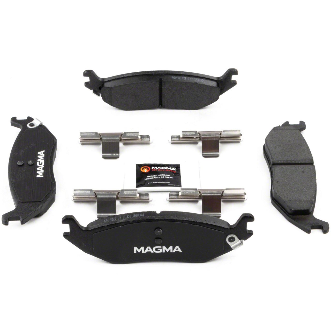 WHY MAGMA? - Today's harsh braking environments can create very high heat levels in your braking system which can reduce the vehicle's ability to stop. Extreme high temperatures can be reached in many braking situations such as - Stop and Go Traffic, Mountain Driving, Hauling or Towing, Emergency Stops, Spirited Driving and Long, Sustained Braking. At MAGMA Brakes, we use FIRE to fight FIRE. Our brake system components are made using advanced, state of the art techniques and treatments that ensure our brakes will stand up to the heat. MAGMA Premium brake pads feature... 1. Scorched, copper-free friction formulations for optimal stopping power 2. Heat-treated rubberized multi-layer shims for superior noise dampening 3. Heat-tempered stainless steel hardware kits to restore the brake pad to caliper interface (where applicable) 4. High-heat resistant brake lubricant included for lubricating critical points during pad installation