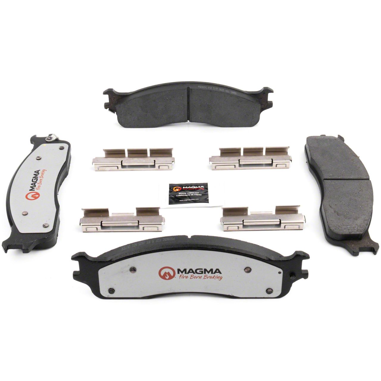 WHY MAGMA? - Today's harsh stop and go environment can create very high heat levels in your braking system which can reduce the vehicle's ability to stop. Extreme high temperatures can be reached in many braking situations such as - Stop and Go Traffic, Mountain Driving, Hauling or Towing, Emergency Stops, Spirited Driving and Long, Sustained Braking. At MAGMA Brakes, we use FIRE to fight FIRE. Our brake system components are made using advanced, state of the art techniques and treatments that ensure our brakes will stand up to the heat. MAGMA Pro-Series brake pads feature... 1. Scorched, copper free friction formulations for overall ltimate braking performance 2. Vulcanized OE style rubber core shims for unsurpassed noise suppression 3. Heat-tempered upgraded dual-coated stainless steel hardware kits to restore the brake pad to caliper interface to "like new" condition (where applicable) 4. Heat expansion OE style slots and chamfers to dissipate noise and stand up to the heat 5. High-heat resistant brake lubricant included for lubricating critical points during pad installation