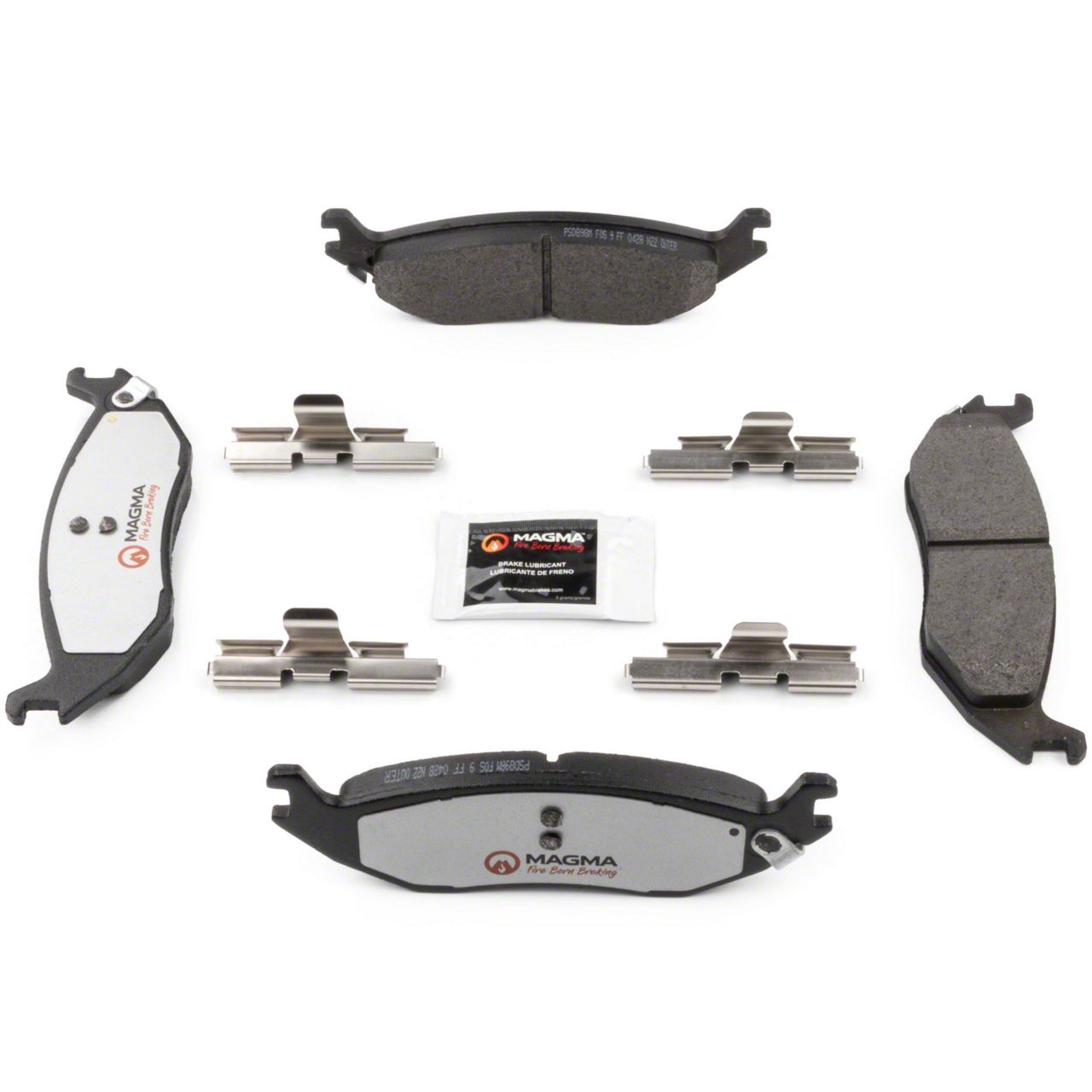 WHY MAGMA? - Today's harsh stop and go environment can create very high heat levels in your braking system which can reduce the vehicle's ability to stop. Extreme high temperatures can be reached in many braking situations such as - Stop and Go Traffic, Mountain Driving, Hauling or Towing, Emergency Stops, Spirited Driving and Long, Sustained Braking. At MAGMA Brakes, we use FIRE to fight FIRE. Our brake system components are made using advanced, state of the art techniques and treatments that ensure our brakes will stand up to the heat. MAGMA Pro-Series brake pads feature... 1. Scorched, copper free friction formulations for overall ltimate braking performance 2. Vulcanized OE style rubber core shims for unsurpassed noise suppression 3. Heat-tempered upgraded dual-coated stainless steel hardware kits to restore the brake pad to caliper interface to "like new" condition (where applicable) 4. Heat expansion OE style slots and chamfers to dissipate noise and stand up to the heat 5. High-heat resistant brake lubricant included for lubricating critical points during pad installation