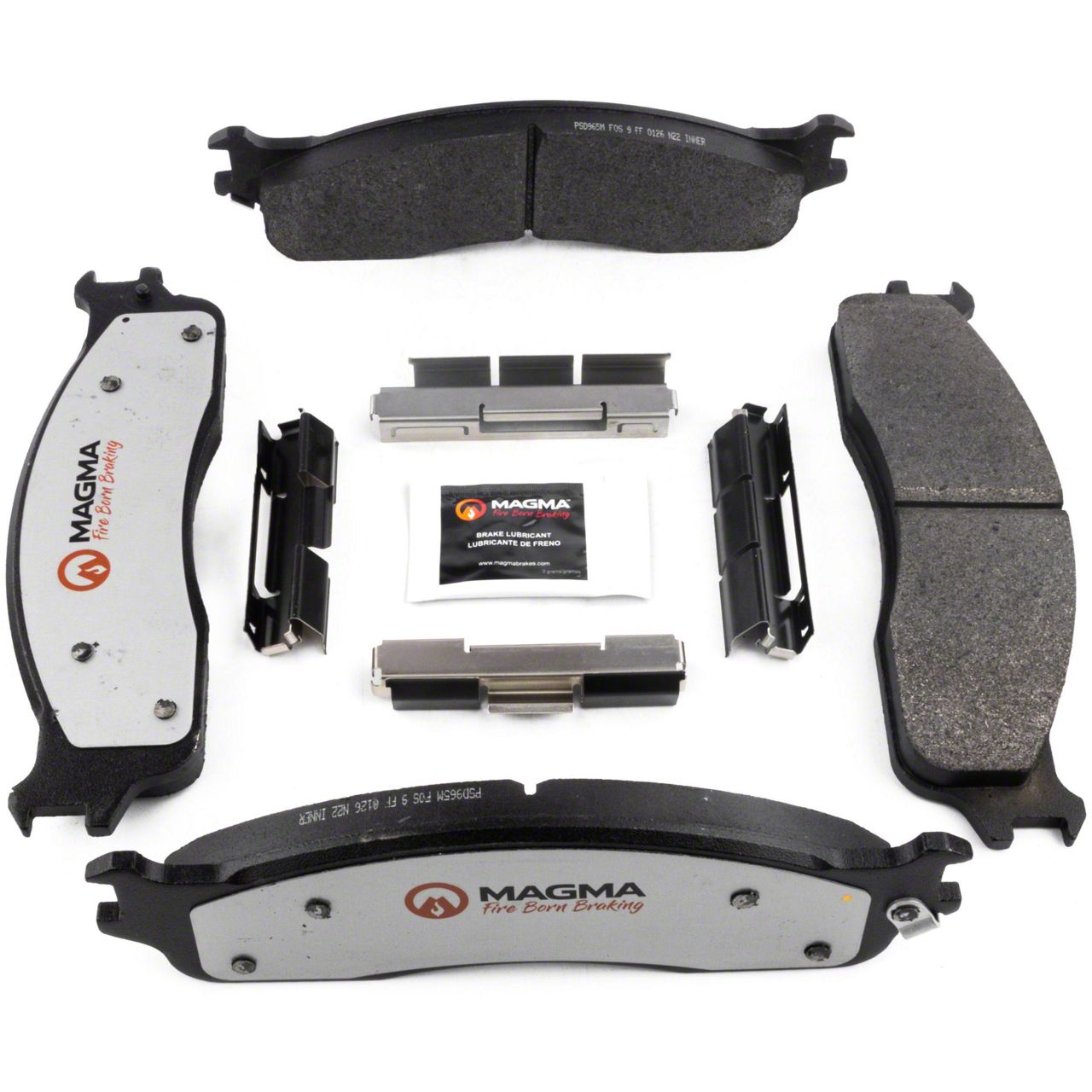 WHY MAGMA? - Today's harsh stop and go environment can create very high heat levels in your braking system which can reduce the vehicle's ability to stop. Extreme high temperatures can be reached in many braking situations such as - Stop and Go Traffic, Mountain Driving, Hauling or Towing, Emergency Stops, Spirited Driving and Long, Sustained Braking. At MAGMA Brakes, we use FIRE to fight FIRE. Our brake system components are made using advanced, state of the art techniques and treatments that ensure our brakes will stand up to the heat. MAGMA Pro-Series brake pads feature... 1. Scorched, copper free friction formulations for overall ltimate braking performance 2. Vulcanized OE style rubber core shims for unsurpassed noise suppression 3. Heat-tempered upgraded dual-coated stainless steel hardware kits to restore the brake pad to caliper interface to "like new" condition (where applicable) 4. Heat expansion OE style slots and chamfers to dissipate noise and stand up to the heat 5. High-heat resistant brake lubricant included for lubricating critical points during pad installation