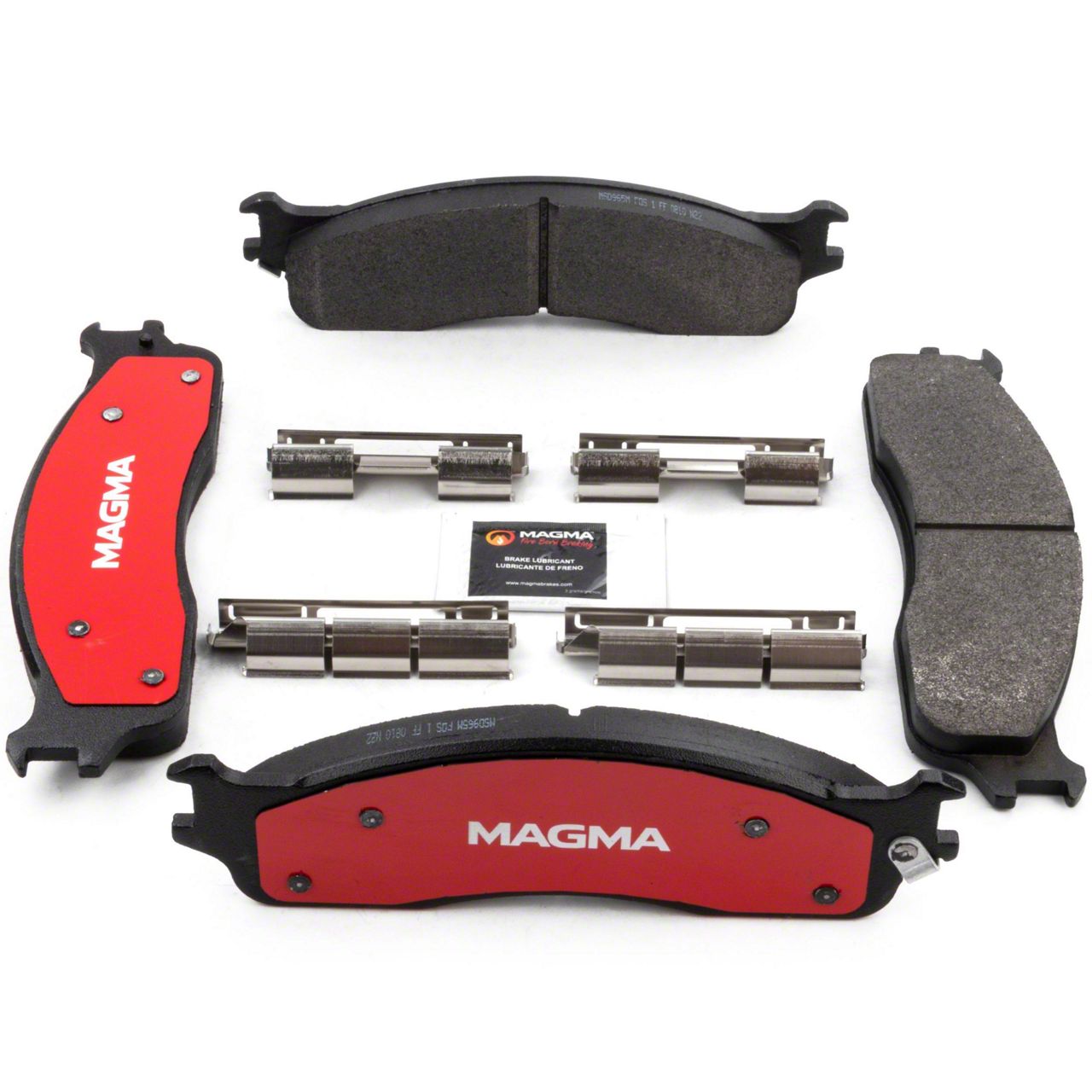 WHY MAGMA? - Today's harsh braking environments can create very high heat levels in your braking system which can reduce the vehicle's ability to stop. Extreme high temperatures can be reached in many braking situations such as - Stop and Go Traffic, Mountain Driving, Hauling or Towing, Emergency Stops, Spirited Driving and Long, Sustained Braking. At MAGMA Brakes, we use FIRE to fight FIRE. Our brake system components are made using advanced, state of the art techniques and treatments that ensure our brakes will stand up to the heat. MAGMA Severe Duty brake pads feature... 1. Advanced copper-free semi-metallic friction material for optimal stopping power and long life under severe conditions 2. Multi-layer shims for superior noise dampening 3. Heat-tempered stainless steel hardware kits to restore the brake pad to caliper interface (where applicable) 4. High-heat resistant brake lubricant included for lubricating critical points during pad installation