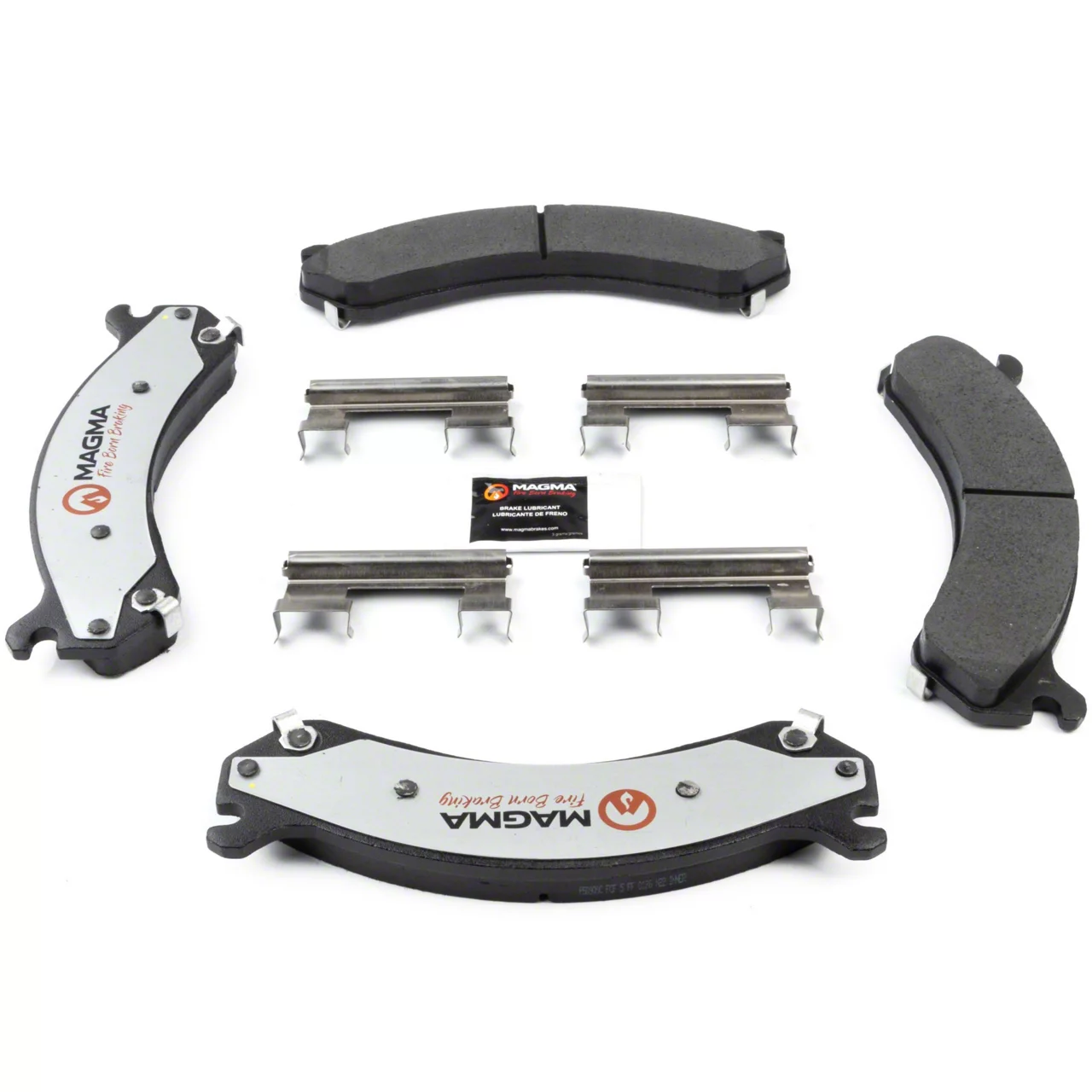 WHY MAGMA? - Today's harsh stop and go environment can create very high heat levels in your braking system which can reduce the vehicle's ability to stop. Extreme high temperatures can be reached in many braking situations such as - Stop and Go Traffic, Mountain Driving, Hauling or Towing, Emergency Stops, Spirited Driving and Long, Sustained Braking. At MAGMA Brakes, we use FIRE to fight FIRE. Our brake system components are made using advanced, state of the art techniques and treatments that ensure our brakes will stand up to the heat. MAGMA Pro-Series brake pads feature... 1. Scorched, copper free friction formulations for overall ltimate braking performance 2. Vulcanized OE style rubber core shims for unsurpassed noise suppression 3. Heat-tempered upgraded dual-coated stainless steel hardware kits to restore the brake pad to caliper interface to "like new" condition (where applicable) 4. Heat expansion OE style slots and chamfers to dissipate noise and stand up to the heat 5. High-heat resistant brake lubricant included for lubricating critical points during pad installation