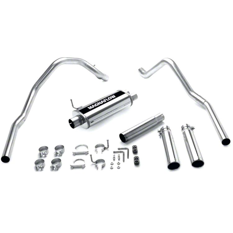 The MagnaFlow Dodge Dakota Street Series 15735 brings out the personality of your 3.9L, 5.2L, 5.9L 1997-1999 Dodge Dakota with our signature resonant, powerful engine tone and dyno-proven performance. Thanks to its fast-flowing, mandrel bent 3in. main piping and 1 Straight-Through mufflers ending in a Dual Split Rear exit with 3.5in. Polished Clamp-On-Single Wall-Angle Cut-Rolled Edge tips, this Dodge Dakota exhaust kit has the performance chops to match its sporty sound and appearance. Upgrade your ride to the next level with an exhaust that has the pipes to put other Dodge Dakota’s to shame. With this system your vehicle will be producing Agressive exterior and Moderate interior sound levels while leaving other cars and trucks feeling envious at every stoplight. Exhaust kit 15735 features a cat-back layout that replaces your ride’s stock exhaust components from near the catalytic converter on back. Extensive 3D scanning during development has resulted in a direct-fit design that you can easily install yourself. 15735 is produced using CNC precision robotic manufacturing techniques and is backed by MagnaFlow’s 1-year limited finish warranty and limited lifetime construction warranty.