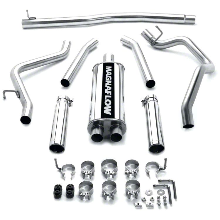 The MagnaFlow Street Series 16622 brings out the personality of your Truck with our signature resonant, powerful engine tone and dyno-proven performance. Thanks to its fast-flowing, mandrel bent 3in. main piping and 1 Straight-Through mufflers ending in a Dual Split Rear exit with 3.5in. Polished Clamp-On-Single Wall-Angle Cut-Rolled Edge tips, this Truck exhaust kit has the performance chops to match its sporty sound and appearance. Upgrade your ride to the next level with an exhaust that has the pipes to put other Truck’s to shame. With this system your vehicle will be producing Agressive exterior and Moderate interior sound levels while leaving other cars and trucks feeling envious at every stoplight. Exhaust kit 16622 features a cat-back layout that replaces your ride’s stock exhaust components from near the catalytic converter on back. Extensive 3D scanning during development has resulted in a direct-fit design that you can easily install yourself. 16622 is produced using CNC precision robotic manufacturing techniques and is backed by MagnaFlow’s 1-year limited finish warranty and limited lifetime construction warranty.
