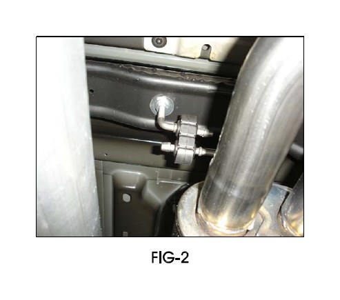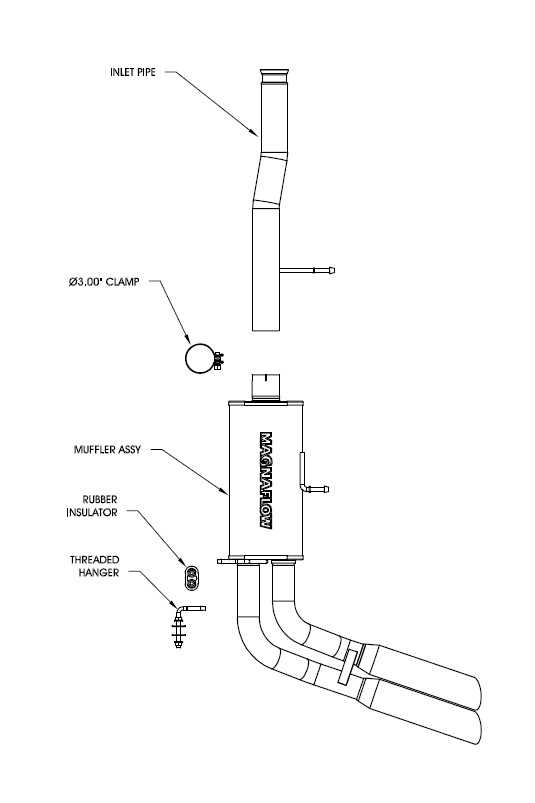 Step 2: Install the new inlet pipe assembly at the ball flare using the OEM fasteners. Leave all clamps and fasteners loose for final adjustments of the new system. Using the supplied 3.00" clamp, install the muffler/tailpipe assembly, and insert the welded hanger into the OEM rubber insulator. Install the threaded hanger in a pre-drilled hole in the frame as shown in Fig.2. Step 3: With all components mounted loosely, adjust the system for overall aesthetics and clearance of frame & bodywork. (MAGNAFLOW recommends at least 1/2" of clearance between the exhaust system and any body panels to prevent heat-related body damage or fire.)