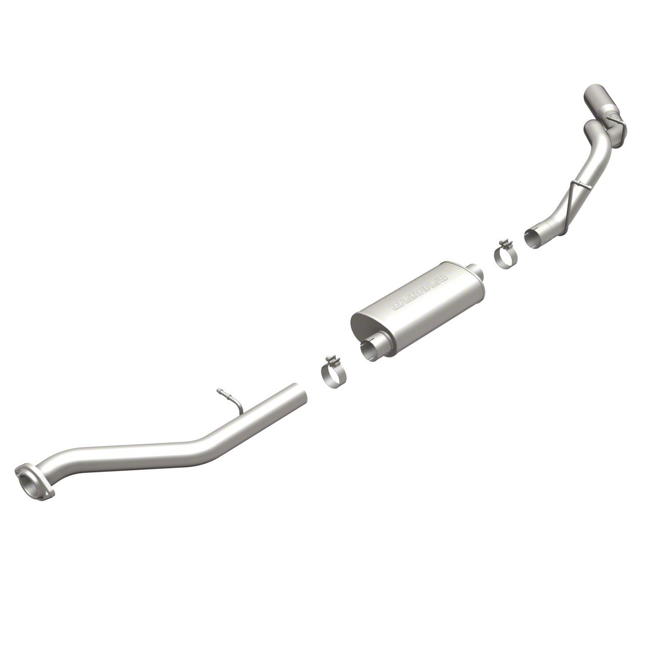 Cat-Back Style. Designed to deliver a clean exhaust cat-back style, this series single exhaust system provides a passenger side exit location for improved horsepower, torque and fuel economy. Guaranteed to deliver controlled engine heat, decreased back pressure and improved exhaust scavenging, this exhaust features a single inlet/single outlet muffler configuration, moderate exhaust sound, 3-inch diameter pipe tubing and all mandrel bent tubing with a 409 polished stainless-steel construction.