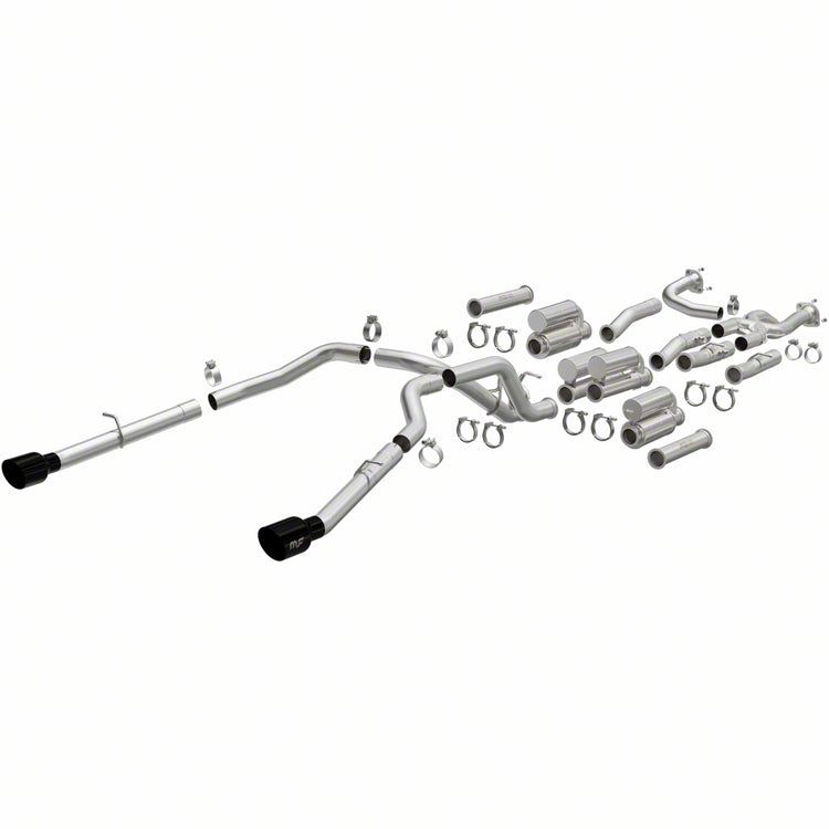 High-Flow Stainless Steel Construction. Crafted from premium T304 stainless steel, the Magnaflow xMOD Series Dual Exhaust System with Black Chrome Tips; Rear Exit offers unmatched corrosion resistance, durability, and precision. The mandrel-bent tubing ensures unrestricted airflow, optimizing horsepower and torque while maintaining consistent performance under extreme conditions.
