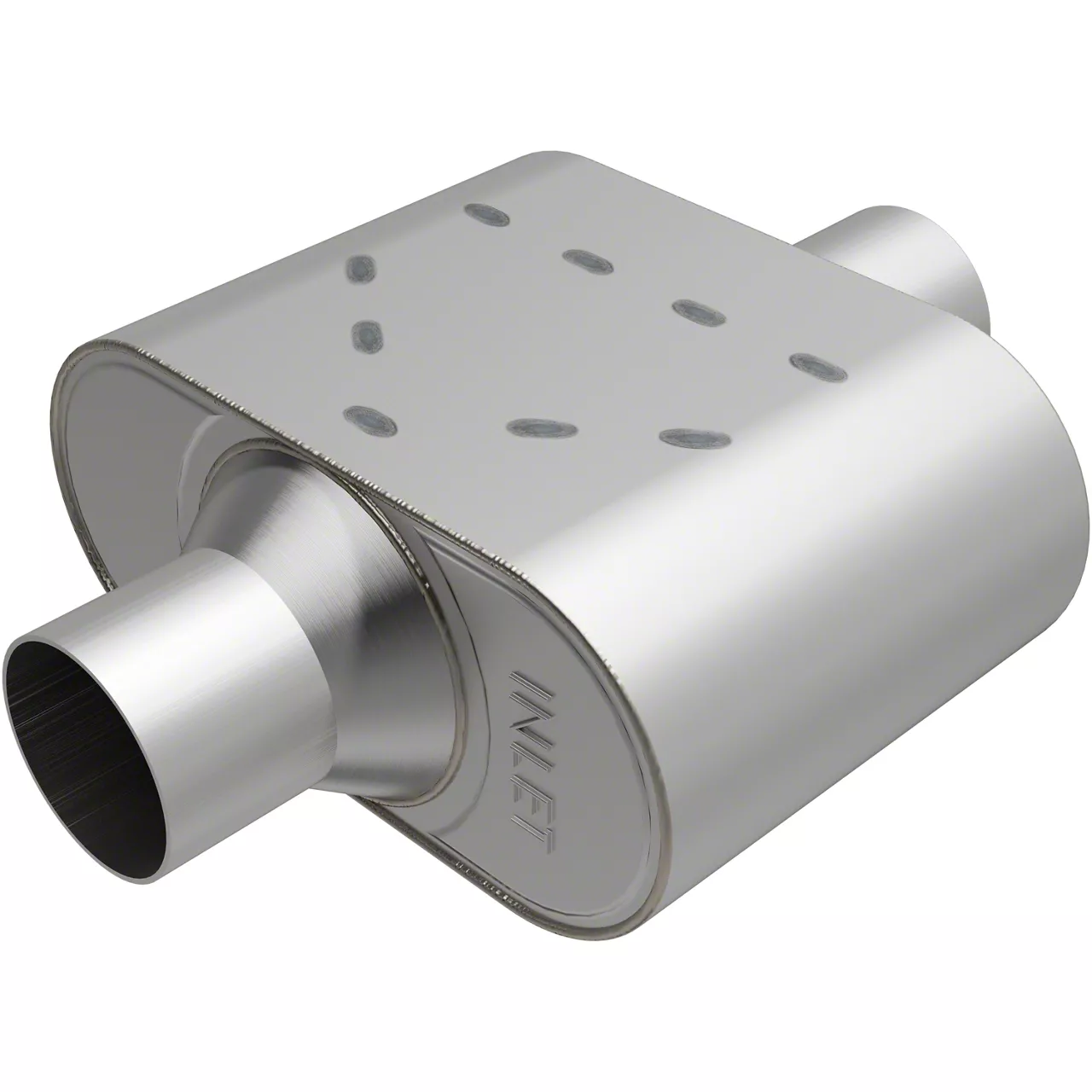 Stainless Steel Oval Case. Constructed from 304 stainless steel, it offers exceptional durability and resistance to corrosion. The oval-shaped case and chambered internal design contribute to the powerful sound and performance characteristics of this muffler.