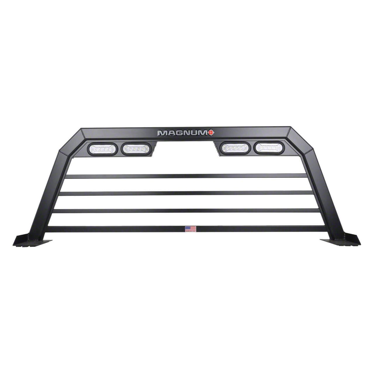 Heavy-Duty Cab Protection. The Magnum High Pro Headache Rack is built for rugged utility and enhanced rear-cab protection, combining strength and lighting integration into one sleek package. Designed to safeguard the rear window and cab area from shifting cargo or debris, this rack also adds visibility with its integrated lighting system. This Magnum High Pro Headache Rack fits 2023-2025 Ford F-250 Super Duty XLT models with factory halogen tail lights.