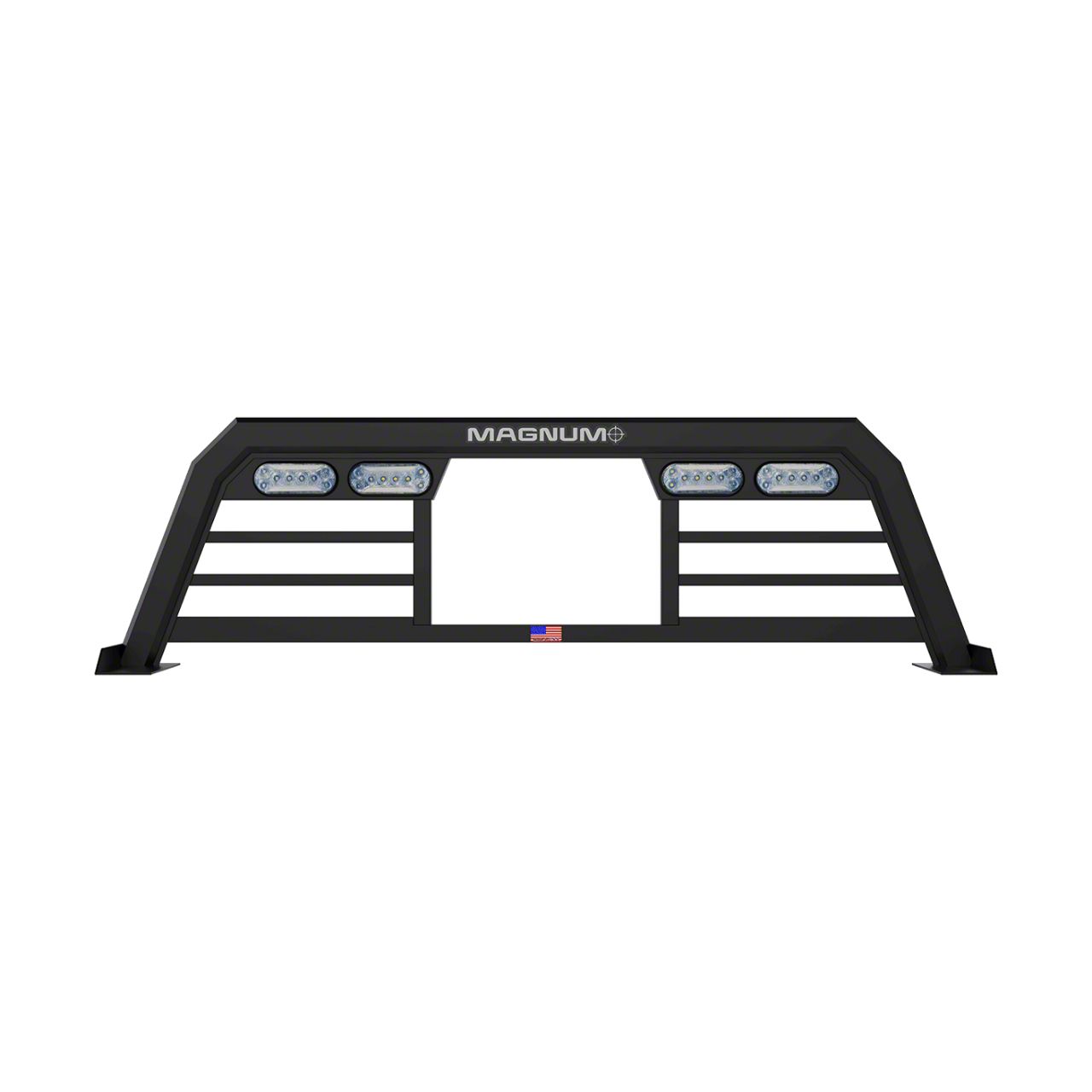 Heavy-Duty Protection with Style. The Magnum Low Pro Headache Rack with Lights and Window Cut-Out provides superior protection for your truck's cab while maintaining a sleek, low-profile design. With integrated brake, signal, and back-up lights, it enhances both safety and functionality, making it a perfect upgrade for work or recreational use. The rear window cut-out allows for improved visibility while maintaining structural strength.
