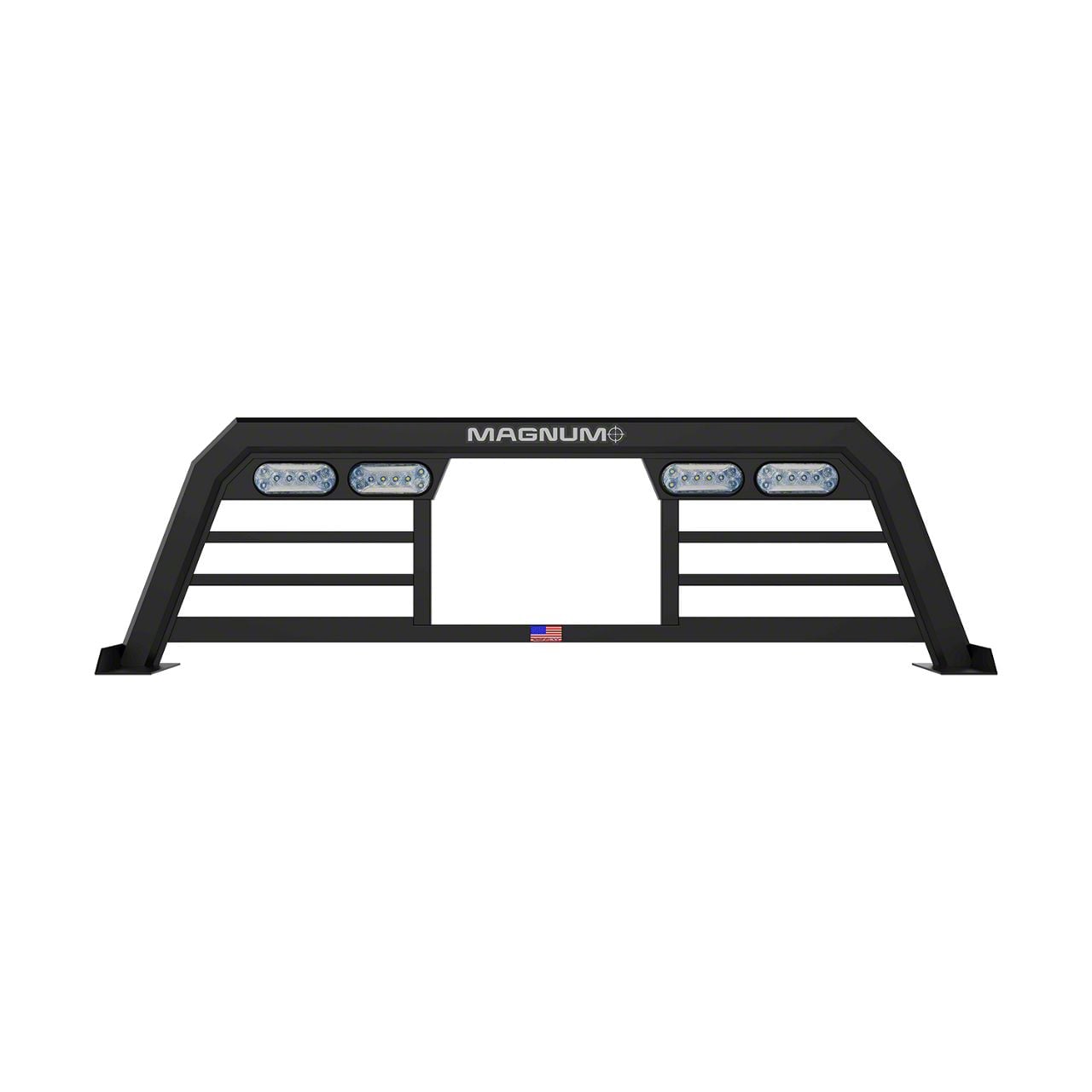 Enhanced Protection and Style. The Magnum Low Pro Headache Rack with Lights and Window Cut-Out is designed to provide superior protection while adding a sleek, classic look to your truck. Sitting flush with the cab, this headache rack enhances the overall aesthetic without compromising fuel efficiency. It is built to withstand tough jobs and harsh weather conditions, making it an ideal choice for work or off-road applications.