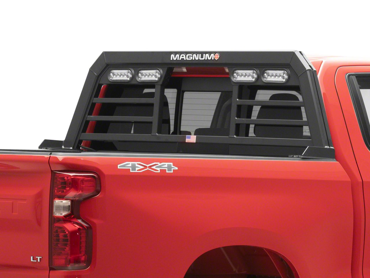 Rugged Protection with a Sleek Design. The Magnum Low Pro Headache Rack is designed to safeguard your truck’s cab while adding a bold, modern look. Featuring integrated lights and window cut-outs, this rack enhances visibility while maintaining rear window access.