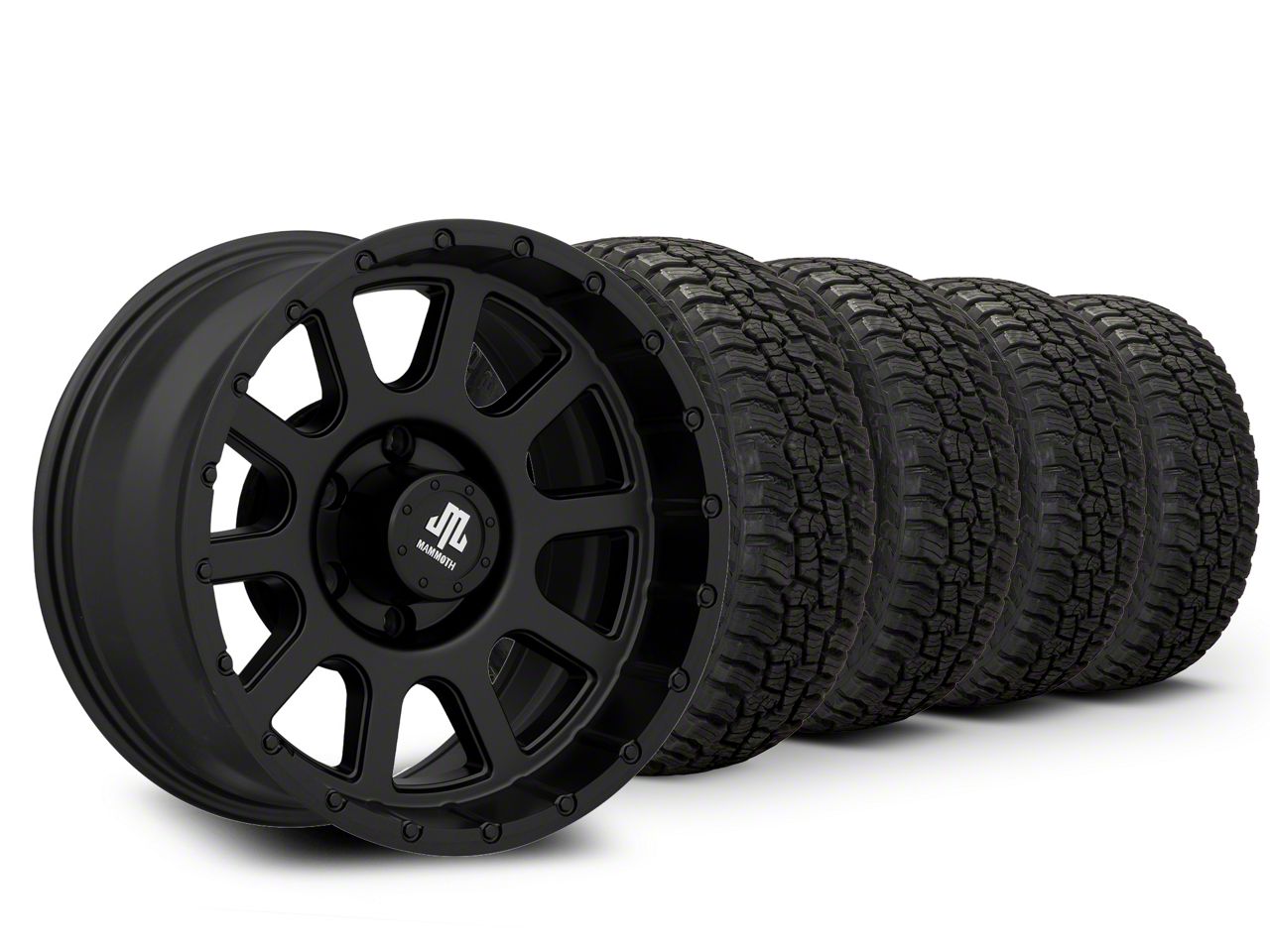 Mounted and Balanced Wheel and Tire Kit. This wheel and tire combo kit features (4) 17x9 Mammoth 10 Hole Matte Black Wheels and (4) Mickey Thompson Baja Boss A/T 33" - 285/70R17 tires that have been put together into an easy to buy kit that arrives to your door already mounted and balanced ready to be installed on your vehicle.
