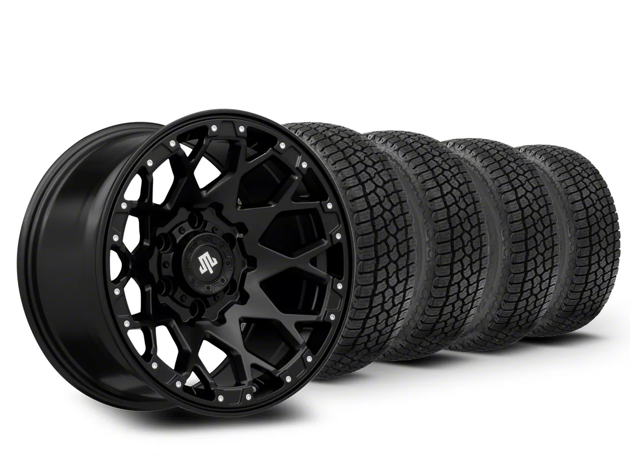 Mounted and Balanced Wheel and Tire Kit. This wheel and tire combo kit features (4) 17x9 Mammoth Vex Satin Black Machined 5-Lug Wheels and (4) Milestar Patagonia AT/R All-Terrain 33" - 285/70R17 tires that have been put together into an easy to buy kit that arrives to your door already mounted and balanced ready to be installed on your vehicle.