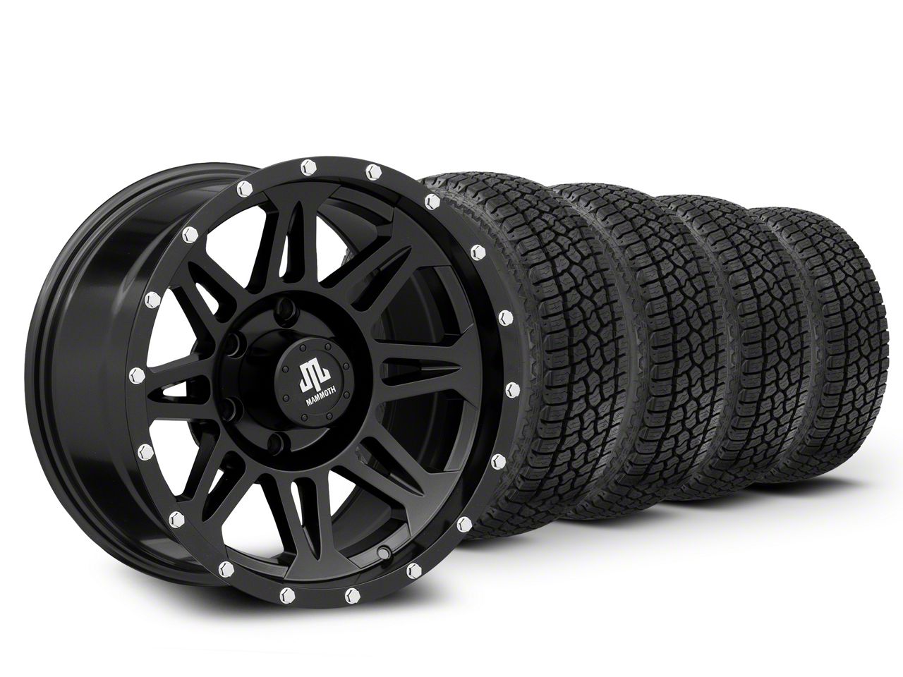 Satin Black Mammoth Split 8 Wheel. Mammoth's Split 8 Wheel features a military inspired split 8-spoke design with simulated bead lock bolts around the lip for rugged good looks. This Wheel is completed in a high quality, clear coated, satin black finish for an aggressive appearance that can withstand the hazards of everyday driving - including road chips and pitting.