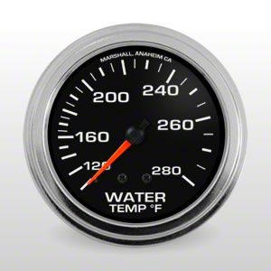 Mechanical Water Temperature Gauge. The Marshall Instruments COMP II Black Dial 2-5/8-Inch Water Temperature Gauge; 100-280 Fahrenheit accurately monitors engine water temperature to help prevent overheating or other temperature-related issues. It is designed for use in street, sport compact, strip, and oval track vehicles, providing essential performance data to drivers and mechanics for improved engine management and safety.