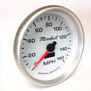 The Marshall 5" in dash 0-160 MPH speedometer features a high end stepper motor movement, two trip meters and through the dial lighting for easy viewing at night. It is available in 2 dial colors (black and white) and three bezel options: silver aluminum, black aluminum and stainless steel step. The speedometer comes preprogrammed for 16,000 pulses per mile and can be easily programmed to work with signals from GPS senders, hall effect senders and vehicle speed sensors with 4,000 to 200,000 pulses per mile.Programmable Speedo FeaturesMarshall in-dash speedometers come in 3-3/8" and 5" sizes and a variety of dial colors and bezel options.Marshall speedometers feature two trip meters and an odometer (miles). Marshall speedometers come precalibrated for 16,000 pulses per mile and can be recalibrated at any time for 4,000 - 200,000 pulses per mile using the included trip/calibration button. Calibration is as easy as pressing the included calibration button and driving one measured mile.Marshall electronic speedometers work with hall effect senders, GPS senders and magnetic pickup sensors (VSS). Any speed sender or electronic module that meets the following conditions can be used with our speedo:Pulse range generated proportional to the vehicle speedSignal with minimum 3V peak to peak signal - typical for 3-wire hall effect and 2 wire vehicle speed sensor outputs4000-200,000 pulses per mile (16,000 is typical).Marshall performance in-dash speedometers and tachometers feature high-speed stepper motor movement, LED through-the-dial lighting, red illuminated pointer, and easy-install u-clamp.Through-Dial LED LightingMarshall gauges feature through-the-dial LED lighting and glowing 3D pointer for a cool look and easy viewing at night.
