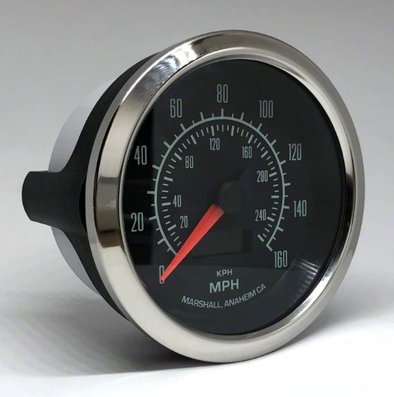 Case Diameter: 3-3/8"Gauge Type: SpeedometerGauge Range: 0-160 MPHSender Included: NoProgrammable Speedo FeaturesMarshall in-dash speedometers come in 3-3/8" and 5" sizes and a variety of dial colors and bezel options.Marshall speedometers feature two trip meters and an odometer (miles). Marshall speedometers come precalibrated for 16,000 pulses per mile and can be recalibrated at any time for 4,000 - 200,000 pulses per mile using the included trip/calibration button. Calibration is as easy as pressing the included calibration button and driving one measured mile.Marshall electronic speedometers work with hall effect senders, GPS senders and magnetic pickup sensors (VSS). Any speed sender or electronic module that meets the following conditions can be used with our speedo:Pulse range generated proportional to the vehicle speedSignal with minimum 3V peak to peak signal - typical for 3-wire hall effect and 2 wire vehicle speed sensor outputs4000-200,000 pulses per mile (16,000 is typical).Marshall performance in-dash speedometers and tachometers feature high-speed stepper motor movement, LED through-the-dial lighting, red illuminated pointer, and easy-install u-clamp.Through-Dial LED LightingMarshall 60's Muscle gauges include sophisticated 2 color white and amber through-the-dial LED lighting.Movement: 270° STEPPER MOTORGauge Face Color: BlackGauge Number Color: Mint GreenLighting Type: Through Dial LEDLighting Color: White and AmberPointer Color: RedBezel Color: Chrome