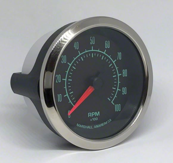 Case Diameter: 3-3/8"Gauge Type: TachometerGauge Range: 0-10,000 RPMSender Included: NoMarshall TachometersMarshall in-dash tachometers are available in 3-3/8" and 5" sizes with a variety of dial colors and bezel options. Marshall tachometers come preprogrammed for 4 pulses per revolution (PPR) and can be easily programmed to work with signals ranging from 0.5 PPR to 6 PPR (1-12 cylinders). Marshall tachometers work with a wide variety of ignition types including standard inductive coil (-), HEI, and electronic ignition systems. Marshall performance in-dash tachometers feature high-speed stepper motor movement, LED through-the-dial lighting, red illuminated pointer, and easy-install u-clamp.Through-Dial LED LightingMarshall 60's Muscle gauges include sophisticated 2 color white and amber through-the-dial LED lighting.Movement: 270° STEPPER MOTORGauge Face Color: BlackGauge Number Color: Mint GreenLighting Type: Through Dial LEDLighting Color: White and AmberPointer Color: RedBezel Color: Chrome
