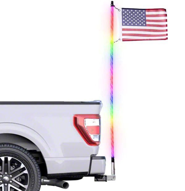 Innovative Illumination. The Master Tailgaters 5-Foot Spiral Chasing LED Flag Pole with Hitch Mount revolutionizes how vehicles can display flags and communicate on the road. It not only serves as a vibrant display of patriotism or team spirit but also enhances safety with its additional brake light and turn signal functionality. This product, with its 20 different colors and 100 lighting modes, allows for personalized lighting experiences for any vehicle.