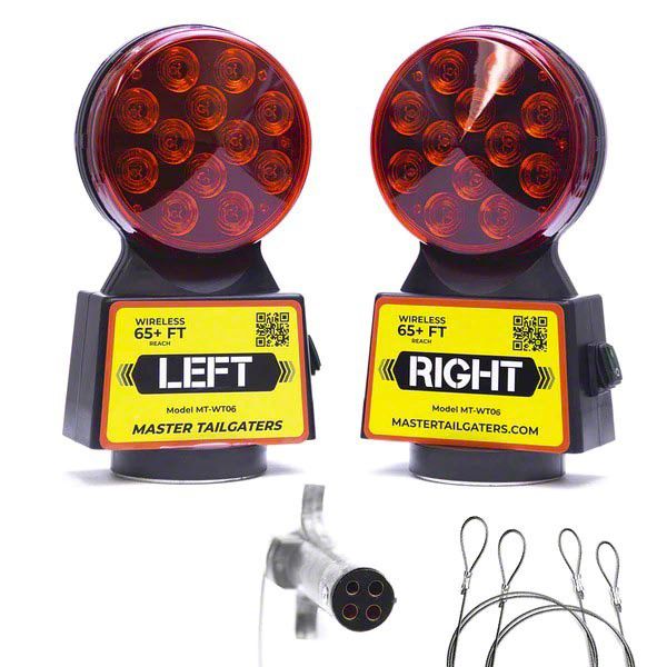 Wireless Trailer Tow Lights. The Master Tailgaters Wireless Trailer Tow Lights are designed for maximum brightness and convenience with 12 LED diodes. These lights serve as brake lights, turn signals, and hazard lights, providing a versatile solution for towing, emergencies, or additional visibility. Wireless functionality ensures a range of up to 65 feet, making it ideal for a variety of applications.