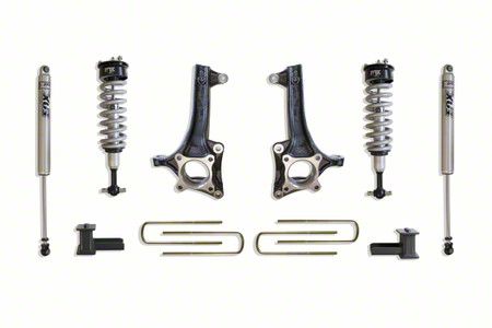 Complete Kit. Made for the Ford F-150, this Max Trac 6.50-Inch Front / 4-Inch Rear Suspension Lift Kit is a complete kit with coilover shocks, lift spindles, and lift blocks. Crafted from premium parts, this kit is guaranteed to last and give your ride years of durable and dependable performance.