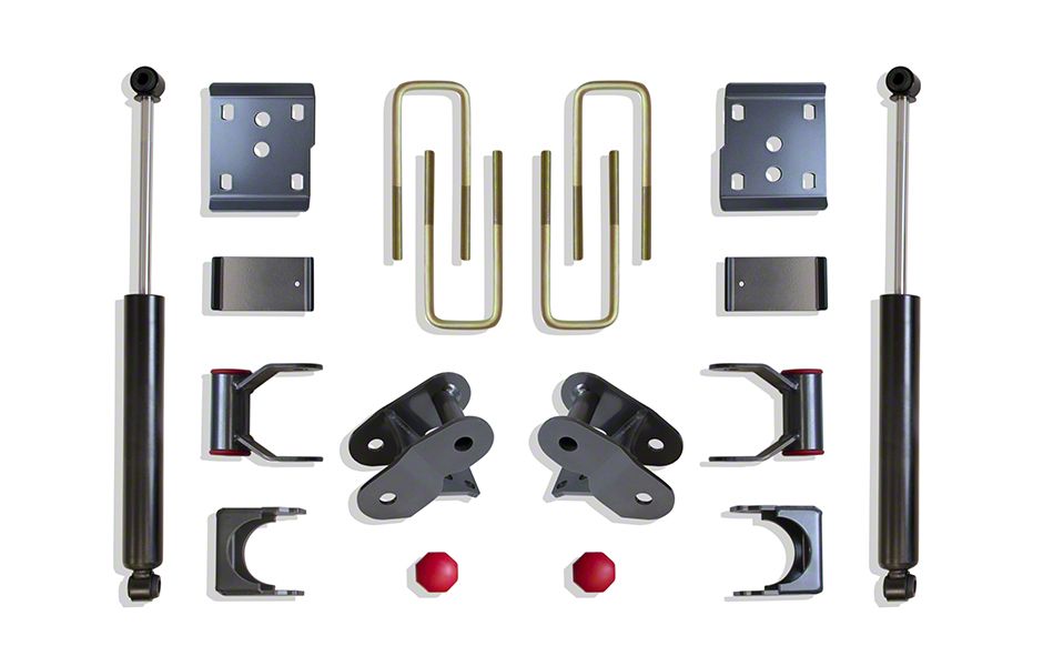 Rear Lowering Suspension Kit. The Max Trac Rear Lowering Kit with Shocks (2WD 3-Inch / 4WD 4-Inch) is engineered to lower the rear ride height of your vehicle, enhancing both stance and handling. This comprehensive kit includes a flip kit, hangers, shackles, bump stops, and rear shocks, designed to provide smooth and reliable performance.
