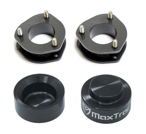 Top-Notch Design. MaxTrac utilizes advanced engineering for its MaxPro Leveling Kits to ensure their rigidity and stability. The 2.5” Front/1.5” Rear Leveling Kit includes heavy duty aluminum coil spacers and ¼” steel plate strut spacers. Its rear shackles have urethrane bushings to reduce vibration and noise. A black powdercoat finish protects the components against rust and corrosion. The lift kit also incorporates extended steering knuckles for extra strength. All parts of this kit are made in the USA.