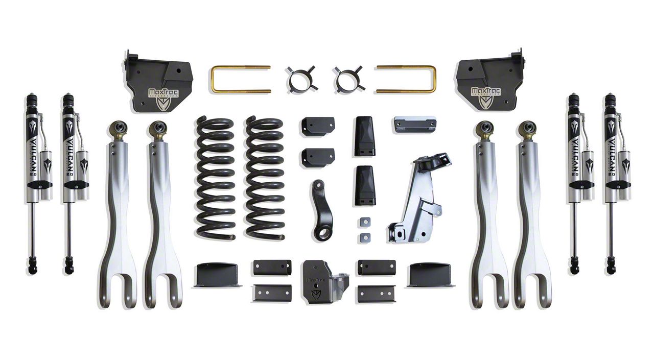 MAX TRAC SUSPENSION’S KIT# K947263VRLA IS A COMPLETE 6″ LIFT KIT INCLUDING DIESEL COILS, FORGED ALUMINUM 4 LINKS, TRAC BAR BRACKET, PITMAN ARM, SWAY BAR BRACKETS, BUMP STOPS, REAR AIR BAG SPACERS, TRAC BAR BRACKET, SWAY BAR BRACKETS, BUMP STOP EXTENSIONS & FRONT/REAR VULCAN SERIES SHOCKS