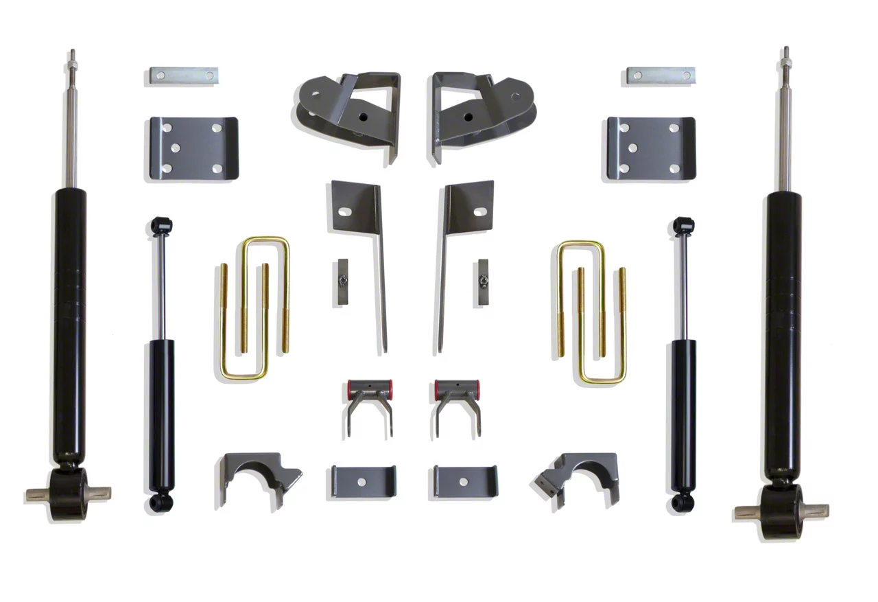 High-Grade Lowering Kit. The Max Trac Strut Lowering Kit; 2-Inch Front / 4-Inch Rear completely reinvents your Silverado 1500's stance with a 2-inch front drop and a 4-inch rear drop to instantly turn heads on the trails. It comes with everything needed for installation, including 2-inch drop spindles, a 4-inch rear kit, axle flip kit, and rear shocks.