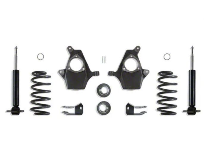 Sleek and Aggressive Stance. The Max Trac Lowering Kit offers a comprehensive solution for Tahoe owners looking to enhance their vehicle's stance with a more aggressive and sleek profile. This full lowering kit provides a front drop of 3 inches and a rear drop of 4 inches, achieving a noticeable transformation in both appearance and driving dynamics. The kit's components, including lowering struts, spindles, rear coils, shock extenders, and sensor rods, are finished in both raw metal and glossy black, offering a striking look that complements the overall aesthetic of the vehicle. This carefully engineered kit ensures that your Tahoe not only looks more imposing but also benefits from improved handling characteristics.