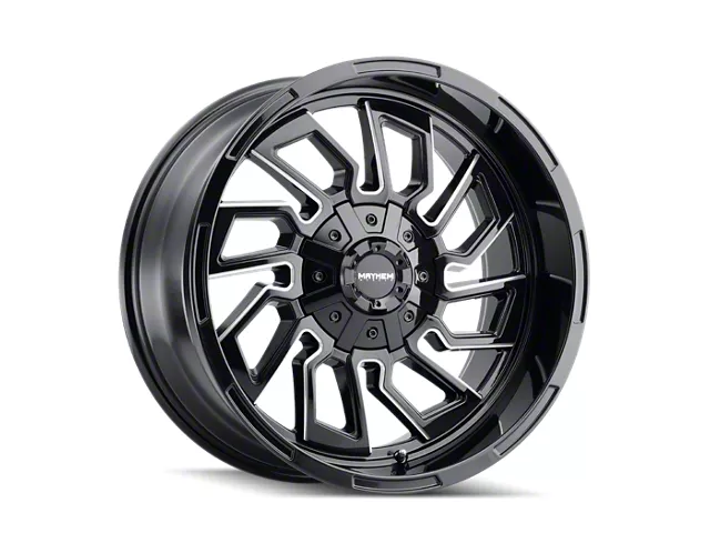 Mayhem Wheels Flywheel Gloss Black Milled 5-Lug Wheel; 22x10; -19mm Offset is a perfect blend of style and rugged design, making it a standout choice for those looking to enhance their vehicle's aesthetic appeal. Its bold, dark metallic finish pairs seamlessly with a wide variety of vehicle styles, offering both modernity and durability. Built by Mayhem Wheels, this wheel is designed to elevate your vehicle's appearance with its robust presence.