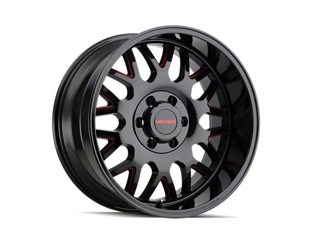 Mayhem Wheels Tripwire Gloss Black Milled with Prism Red 6-Lug Wheel; 20x9; 18mm Offset is a perfect blend of style and rugged design, making it a standout choice for those looking to enhance their vehicle's aesthetic appeal. Its bold, dark metallic finish pairs seamlessly with a wide variety of vehicle styles, offering both modernity and durability. Built by Mayhem Wheels, this wheel is designed to elevate your vehicle's appearance with its robust presence.