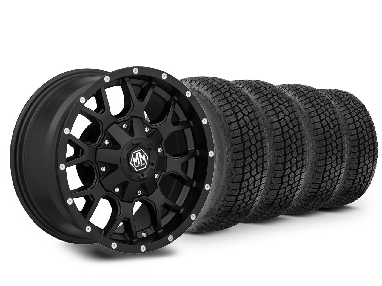 Mounted and Balanced Wheel and Tire Kit. This wheel and tire combo kit features (4) 17x9 Mayhem Warrior Matte Black 6-Lug Wheels and (4) Milestar Patagonia AT/R All-Terrain 285/70R17 tires that have been put together into an easy to buy kit that arrives to your door already mounted and balanced ready to be installed on your vehicle.