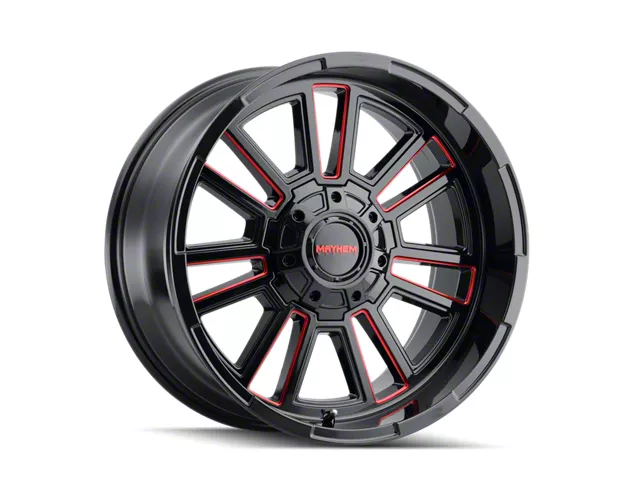 Mayhem Wheels Apollo Gloss Black Milled with Prism Red 8-Lug Wheel; 20x9; 0mm Offset is a perfect blend of style and rugged design, making it a standout choice for those looking to enhance their vehicle's aesthetic appeal. Its bold, dark metallic finish pairs seamlessly with a wide variety of vehicle styles, offering both modernity and durability. Built by Mayhem Wheels, this wheel is designed to elevate your vehicle's appearance with its robust presence.