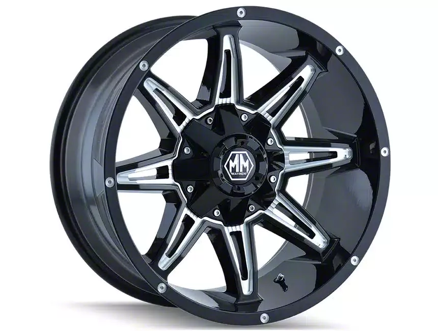 This 17x9 Mayhem Wheels Rampage Gloss Black Milled 6-Lug Wheel is completed in a high-quality gloss black finish with steel milled accents that will create a striking appearance. There's a durable clear coat that protects against driving hazards.