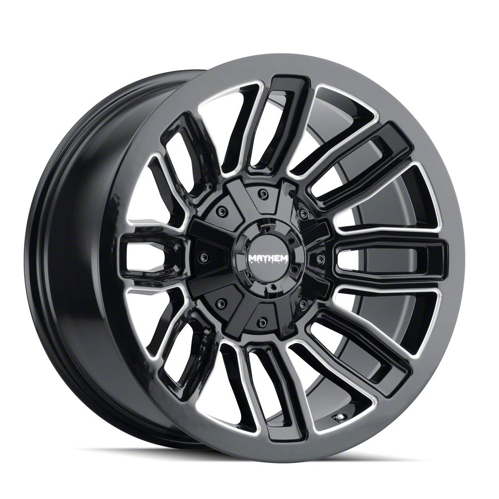 Mayhem Wheels Decoy Gloss Black Milled 8-Lug Wheel; 20x10; -19mm Offset This Mayhem Wheels Decoy Gloss Black Milled 8-Lug Wheel; 20x10; -19mm Offset brings a sleek and modern touch to your vehicle with its striking design. Its refined finish and bold styling make it an excellent choice for those looking to enhance their car’s visual appeal. Whether you're aiming for a sporty look or a more aggressive stance, this wheel stands out as a premium addition. Perfect for drivers who appreciate a stylish upgrade.
