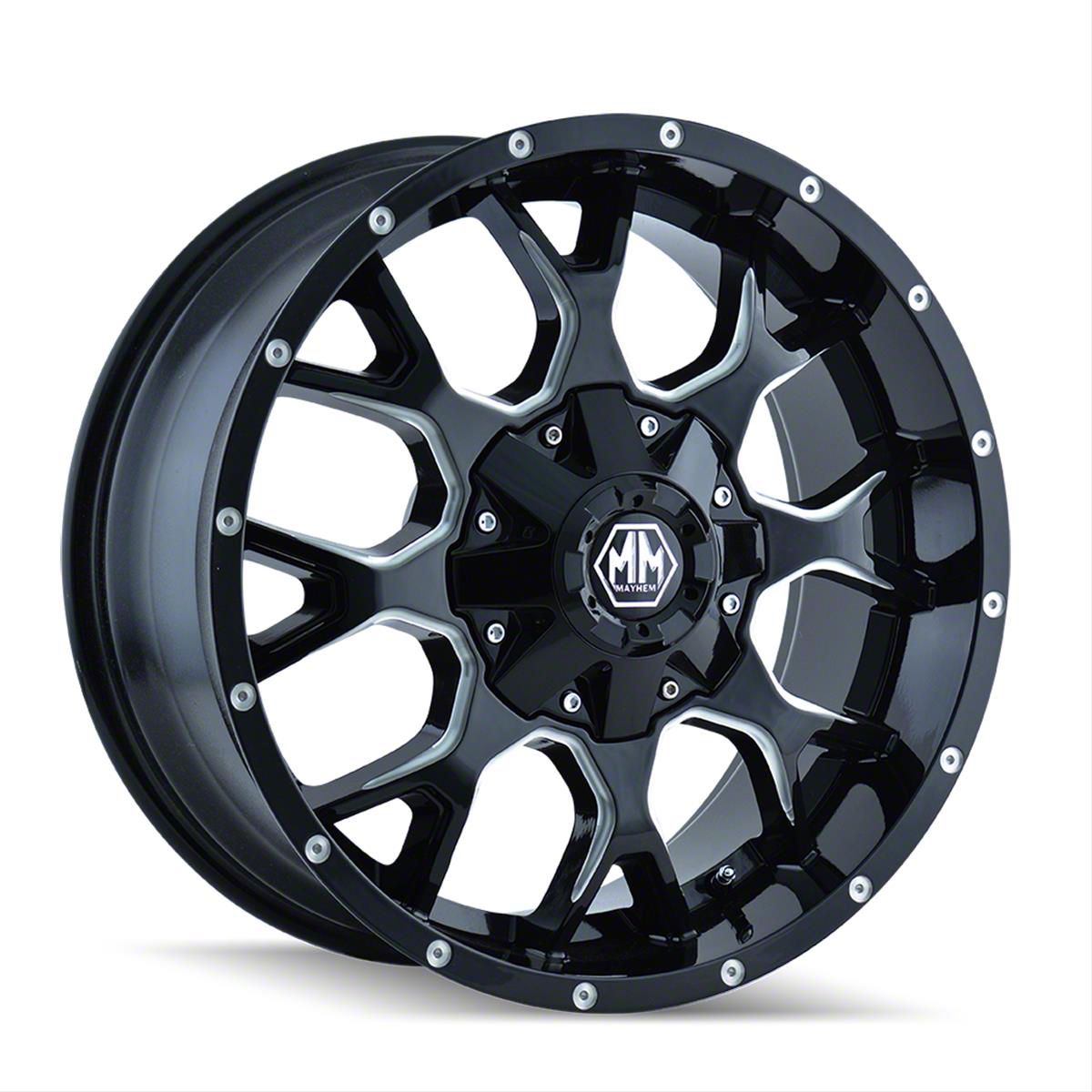 Application. This Mayhem Wheels Warrior Gloss Black Milled 8-Lug Wheel; 18x9; 18mm Offset with a backspace of 5.709 Inch, 145.1mm and bolt pattern of 8 x 180mm (8 x 7.08661-Inch) ensures impeccable alignment and unmatched driving stability. Specifically designed for 2015-2019 Silverado 2500 HD models, each wheel is sold individually.