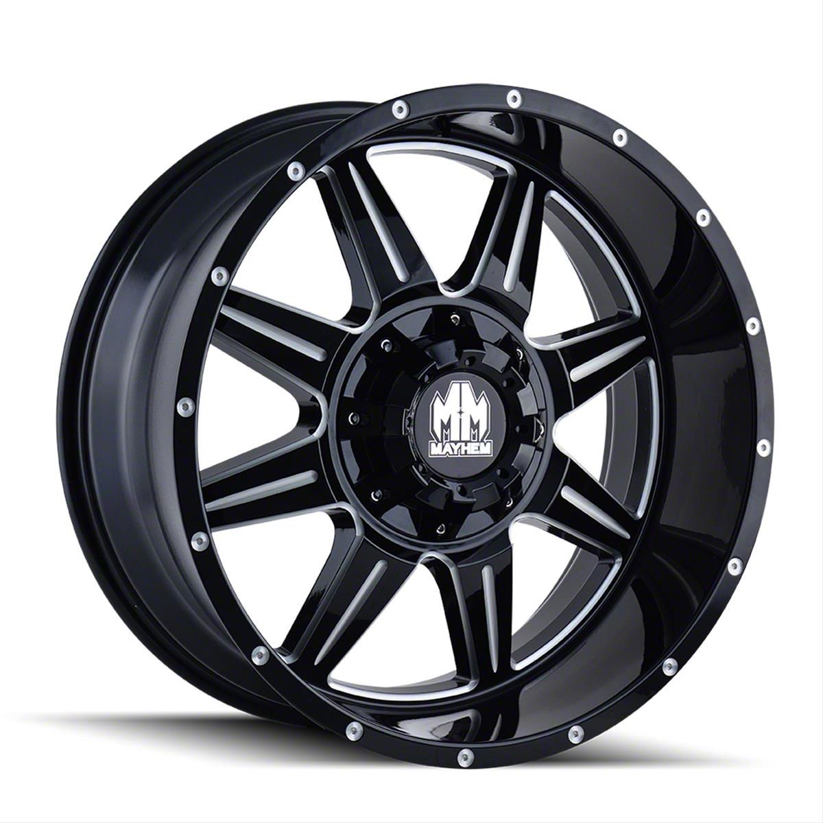 The 18x9 Mayhem Wheels Monstir Gloss Black Milled 6-Lug Wheel; 18x9; -12mm Offset is completed in a high quality, gloss black finish. The milled steel accents are where it really shines through. The accents make the split section of the spokes pop along the faux beadlock.