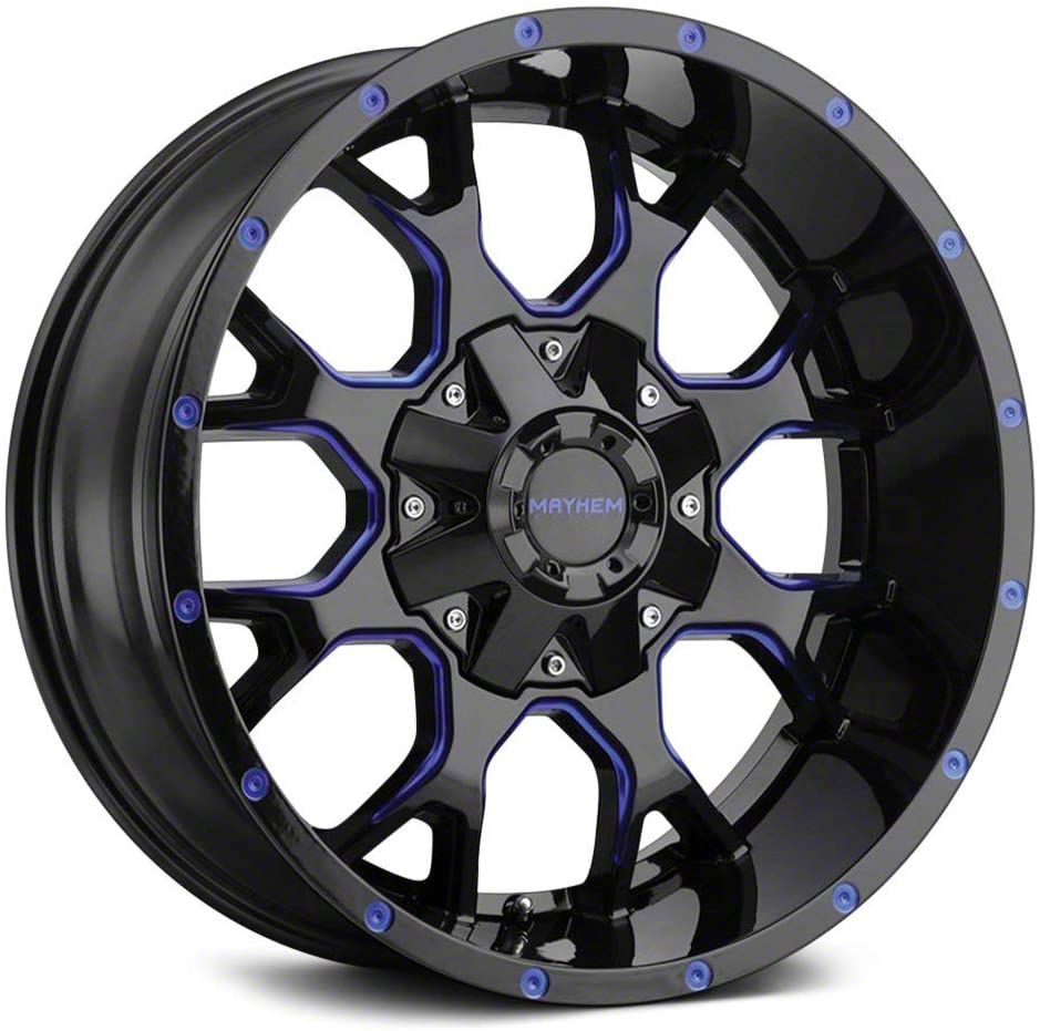 This 20x10 Mayhem Wheels Warrior Black with Prism Blue 6-Lug Wheel is completed in a high-quality, distinct blue finish that will be the envy of everyone. There's a durable clear coat that protects against driving hazards.
