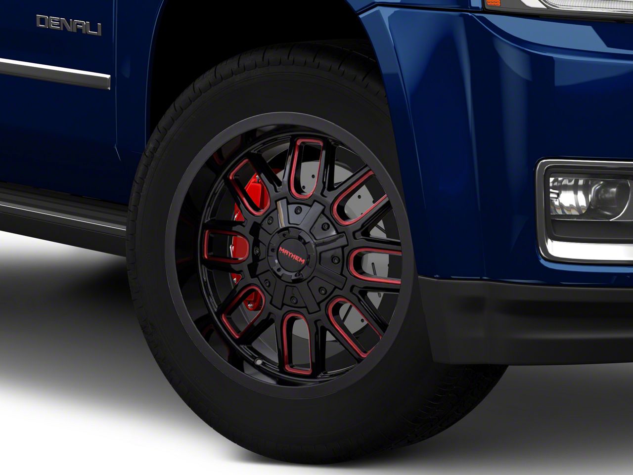 Application. This Mayhem Wheels Cogent Black with Prism Red 6-Lug Wheel; 20x9; 0mm Offset with a backspace of 5 Inch, 127mm and bolt pattern of 6 x 139.7mm (6 x 5.5-Inch) ensures optimal alignment, unparalleled driving stability, and an impeccable fit with your vehicle. It is designed to fit the 2015-2020 Yukon models. Sold individually.