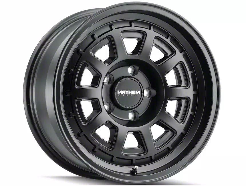 Mayhem Wheels Voyager Matte Black 6-Lug Wheel; 18x9; 0mm Offset. The Mayhem Wheels Voyager Matte Black 6-Lug Wheel offers a striking balance of style and refinement. Its unique design accentuates the vehicle's aesthetic, while the premium construction underscores its robust nature. This wheel is a perfect choice for those seeking both elegance and a strong visual statement.