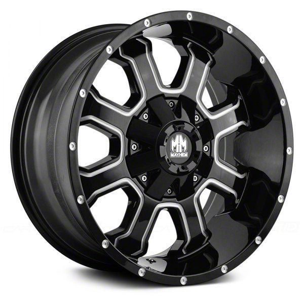 Gloss Black with Milled Accents. This Mayhem Wheel features a high quality black finish with milled accents for aggressive good looks that everyone will be envious of. For added protection, this Wheel features a durable, gloss clear coat that is tough enough to stand up against the hazards of everyday driving - including road chips and pitting.