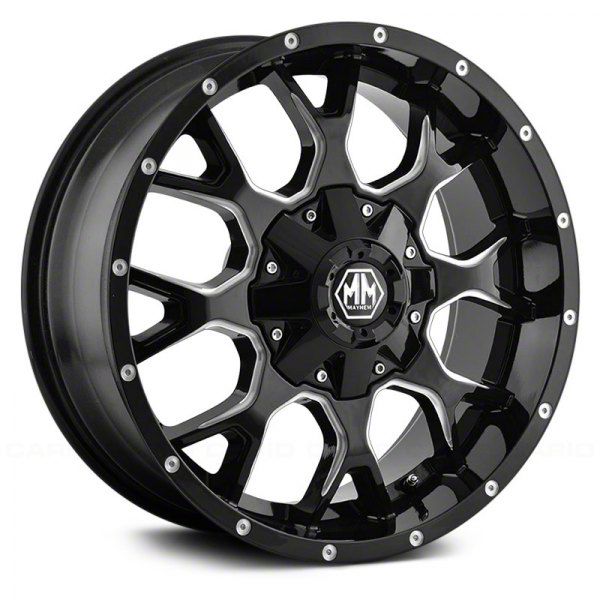 Black with Milled Accents. This Mayhem Wheel features milled accents and a high quality black finish for aggressive good looks that everyone will be envious of. For added protection and good looks, this Wheel features a durable, clear coat that is tough enough to stand up against the hazards of everyday driving - including road chips and pitting.