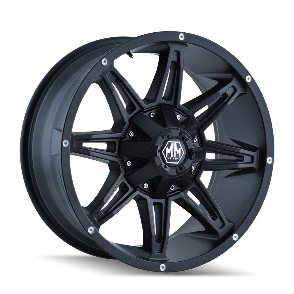 The 20x9 Mayhem Wheels Rampage Matte Black 6-Lug Wheel is completed in a high-quality matte black finish for an aggressive appearance that will make everyone green with envy.