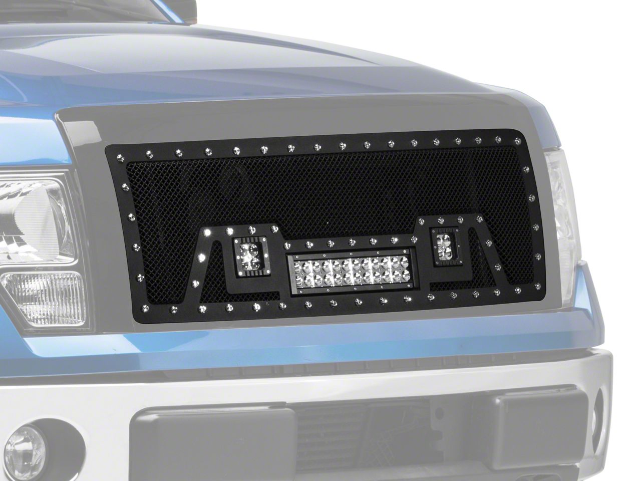Aggressive Styling. Add an aggressive edge to your F-150 with this SpeedForm Black Stainless Steel grille with LED Light. It features a perimeter trim and wire mesh grille in stainless steel with chrome ABS rivets for extreme style and protection from road debris. It also includes one 12 inch and two 2 inch LED Lights to light up the trail or camp site. This upper grille is a replacement grille that requires removing your factory grille and shell.